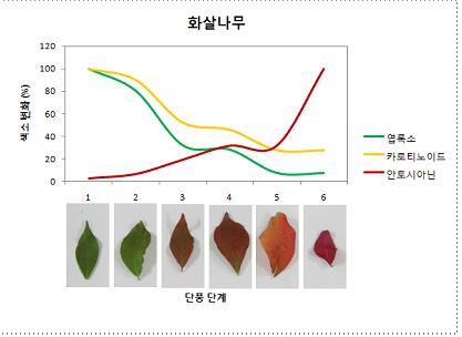 [아시아경제 왕성상 기자] 가을이 깊어가면서 전국의 주요 산에 단풍놀이 인파가 넘쳐난다. 주말을 맞아 산을 찾는 사람들이 이번 주도 예외가 아닐 전망이다.올해는 평년보다 높은 기온과 잦은 비로 단풍이 10일 이상 느리다는 게 22일 국립산림과학원의 분석이다. 최근 갑자기 떨어진 기온 등 변덕스런 날씨가 이어지면서 ‘늦어지는 단풍이 과연 고운 빛을 낼 수 있을까?’ 하는 생각을 갖게 한다. 여기엔 나뭇잎을 알록달록 물들이는 안토시아닌에 비밀이 숨어있다.◆단풍의 6단계 잎 색소 함량 변화=국립산림과학원은 다채로운 단풍색의 비밀을 안토시아닌으로 풀어냈다. 왕벚나무, 화살나무, 산철쭉을 대상으로 단풍의 6단계 잎 색소 함량 변화를 측정한 결과 그 원리를 알아냈다.나무 종류별로 색소 함량 변화의 속도가 달랐다. 공통적으로 엽록소가 카로티노이드계 색소보다 빠르게 부서지면서 색이 달라졌다. 특히 단풍색의 핵심물질로 주목한 붉은 색의 안토시아닌 양의 증가 정도가 단풍색 변화를 이끌었다. 산철쭉은 초기부터 빠르게 합성돼 안토시아닌이 늘었다. 왕벚나무는 서서히 느는 반면 화살나무는 5단계에서 급격한 증가를 보였다. 이처럼 단풍시기에 따른 여러 색소함량 변화가 다채로운 단풍 색을 준다. 나무 종류마다 잎이 가지고 있는 색소 종류와 양이 달라 특색 있는 단풍 빛깔을 나타내는 것이다. 안토시아닌의 역할은 강한 햇빛으로 인한 세포파괴를 일으키는 활성산소 생성을 억제시켜 잎의 늙음을 늦춰준다. 나무 한 그루에서도 나무 꼭대기나 빛이 잘 드는 쪽의 잎이 먼저 또는 더 붉게 단풍이 든다. ◆단풍이 되기 위한 조건과 원리=가을 단풍의 아름다움을 결정하는 환경적 조건은 온도, 햇빛, 수분이다. 단풍이 아름다우려면 뭣보다 낮과 밤의 온도차가 커야한다. 영하로 내려가면 안 되고 하늘은 맑고 햇볕 양이 많아야 한다. 특히 붉은색을 띠는 안토시아닌은 기온이 영하로 떨어지지 않는 범위에서 온도가 서서히 내려가면서 햇빛이 좋을 때 단풍색이 가장 좋다. 때문에 알맞은 습도를 유지해야 아름다운 단풍을 볼 수 있다. 갑자기 추워지거나 비가 오는 날엔 나뭇잎이 충분히 물들기 전에 떨어지고 너무 매 마르면 단풍물이 들기 전에 잎이 타게 돼 아름다운 단풍잎을 보기 어렵다. ◆단풍 색깔별 대표나무들=단풍 색깔로 나무 종류를 나누면 몇 가지가 된다. 단풍나무, 신나무, 옻나무, 붉나무, 화살나무, 복자기, 담쟁이덩굴 등은 붉은 색 단풍으로 꼽힌다.화살나무의 단풍 단계 그래프.