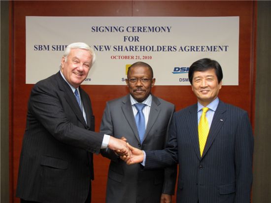 (오른쪽부터)남상태 대우조선해양 사장과 무혼고 숨베 소난골 홀딩스 사장, 프랑시스 블랑쉬란드 SBM 오프쇼어 사장(왼쪽)이 앙골라 파이날(PAENAL) 조선소 지분 인수 계약식을 마친후 악수하고 있다.