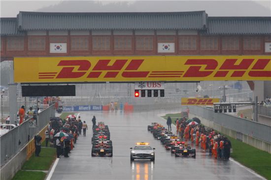 [아시아경제 지선호 기자]4일 오후 전라남도 영암군 코리아 인터내셔널 서킷에서 진행된 '2010 포뮬러원(F1) 코리아 그랑프리' 결선에서 내리는 비 때문에 경기 시작 전 세이프티카가 참가 머신들의 전열을 가다듬기 위해 앞장서있다.지선호 기자 likemore@<ⓒ세계를 보는 창 경제를 보는 눈, 아시아경제(www.asiae.co.kr) 무단전재 배포금지>지선호 기자 likemore@<ⓒ아시아 대표 석간 '아시아경제' (www.newsva.co.kr) 무단전재 배포금지>