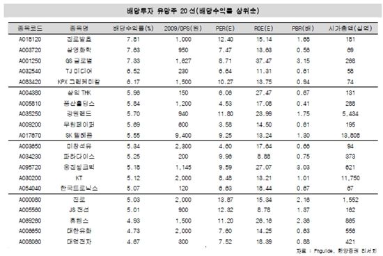 진로발효의 경우 배당수익률 7.81%로 가장 높은 전망치를 기록했으며 삼영화학 7.63%, GS글로벌 7.33%으로 뒤를 이었다. 이밖에 TJ미디어, KRX그린케미칼, 삼익THK, 풍산홀딩스 등도 고배당주로 선정됐다. 그는 "배당투자 유망주들에 대한 전망에 있어 대형주의 경우 안정적 주가흐름이 예상되지만 배당매력만으로 시세가 결정되지 않기 때문에 종합지수대비 초과수익 달성이 여의치 않을 가능성이 높다" 면서 "반대로 중소형 배당주는 초과수익 가능성이 높은 반면 거래량이 많지 않은 편이라 발 빠른 대응이 여의치 않을 수 있음을 동시에 감안할 필요가 있을 것"이라고 조언했다. 배당투자 전략으로는 ▲배당기산일 전 주가가 충분히 상승세를 나타낸 경우 배당수익을 포기하고 차익 실현하는 방법 ▲배당을 받을 경우에는 매도시점을 늦춰 주가가 충분히 회복된 이후에 매도 타이밍을 조율 방법 ▲실적과 배당성향이 꾸준히 양호한 기업들은 장기투자로 지속 보유하는 방법 등을 제시했다. 김현정 기자 alphag@<ⓒ세계를 보는 창 경제를 보는 눈, 아시아경제(www.asiae.co.kr) 무단전재 배포금지>