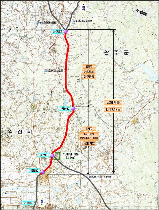 [아시아경제 황준호 기자] 한국도로공사는 오는 27일 오전 11시부터 호남고속도로 논산~삼례구간 17.1km를 4차로에서 6~8차로로 확장해 개통한다.이번 논산~삼례 구간은 지난 2005년 말 착공해 총 2116억원의 사업비가 투자된 구간이다. 주행시간은 6분이 단축돼 연간 410억원의 물류비가 절감될 전망이다. 이산화탄소 등 오염물질 배출량도 연간 2720톤이 감소될 것으로 예상되며 환경개선 비용도 연간 33억원 가량 절감될 것으로 관측된다. 물류비는 연간 410억원 가량을 줄일 수 있을 전망이며 이용시간은 6분 가량 단축될 것으로 나타났다. 도로공사 관계자는 "논산~삼례구간은 최근 개통된 익산~장수 고속도로와 함께 호남지역의 교통수요를 분담해 호남권 정체 해소와 물동량의 운송 효율성을 증가시킬 것"이라며 "지역관광산업 활성화에도 크게 기여할 것으로 기대된다"고 밝혔다. 황준호 기자 rephwang@<ⓒ세계를 보는 창 경제를 보는 눈, 아시아경제(www.asiae.co.kr) 무단전재 배포금지>