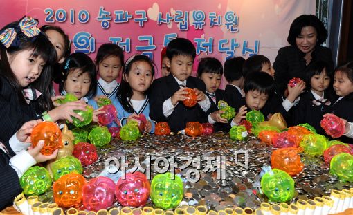 [아시아경제 이재문 기자]25일 송파구청에서 열린 '사랑의 저금통 전달식'에서 유치원생 어린이들이 불우이웃을 돕기 위해 1년간 채워 온 저금통을 뜯어 '사랑의 동전밭'에 기부하고 있다.이재문 기자 moon@<ⓒ세계를 보는 창 경제를 보는 눈, 아시아경제(www.asiae.co.kr) 무단전재 배포금지>