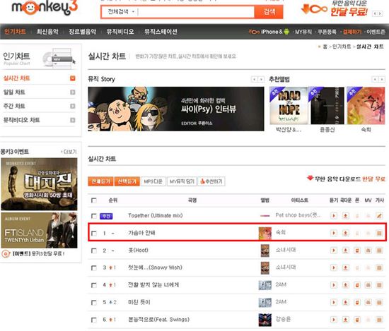 [스포츠투데이 최준용 기자]차세대 발라드여왕 숙희의 신곡 '가슴아 안돼'에 대한 음악팬들의 반응이 뜨겁다. 숙희는 지난 28일 자정에 디지털 싱글앨범 '가슴아 안돼'를 온라인 음악사이트 공개 후 소녀시대, 2AM을 제치고 실시간 차트 1위를 차지하는 기염을 토했다. 음악전문사이트 몽키3의 실시간차트(28일 22시 기준)에서 숙희의 신곡 '가슴아 안돼'가 소녀시대의 '훗', 2AM의 '전활 받지 않는 너에게' 등 톱스타들을 제치고 1위에 안착하는 이변을 연출한 것이다. 뿐만 아니라 숙희는 발매 당일 주요포털사이트 실시간검색순위 1위를 비롯해 싸이월드, 엠넷, 벅스 등 음악사이트에도 상위권에 진입하는 등 하루 만에 가요계의 핫이슈로 떠올랐다. '가슴아 안돼'는 가요계 명콤비 작곡가 조영수와 작사가 강은경의 작품으로 한 번에 귀를 사로잡는 매력적인 멜로디 속에 애절한 가사가 어우러진 어쿠스틱 발라드곡으로 숙희만의 듣고만 있어도 눈물 날 듯한 새드보컬(Sad Vocal)이 매력적인 노래이다. 숙희의 '가슴아 안돼'를 접한 팬들은 "목소리도 가창력도 참 좋은 가수이다. 잘 됐으면 좋겠다" "노래 정말 좋다. 대박나라" "역시 기대한 만큼 최고. 이런 노래가 상위권에 오래 머물렀으면 좋겠다"라는 등 뜨거운 반응을 보이고 있다.