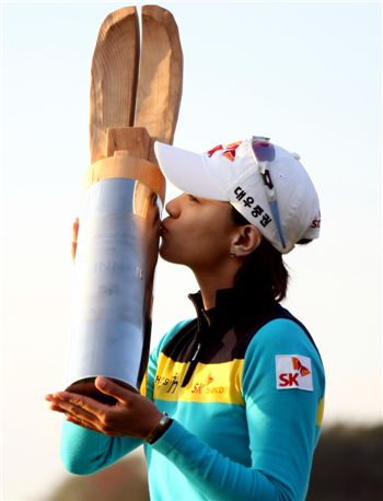 최나연이 LPGA하나은행챔피언십 최종일 역전우승으로 '대회 2연패'의 위업을 달성한 뒤 우승트로피에 감격의 입맞춤을 하고 있다. 사진=하나은행챔피언십<ⓒ세계를 보는 창 경제를 보는 눈, 아시아경제(www.asiae.co.kr) 무단전재 배포금지>