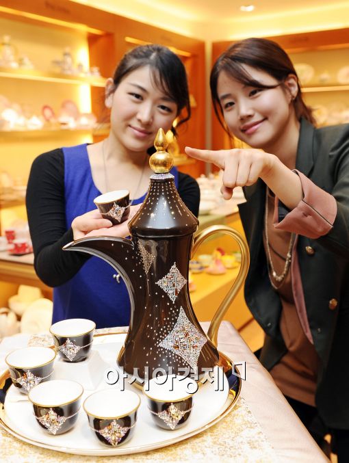 [아시아경제 이재문 기자]한국도자기가 4일 서울 신세계백화점 본점에서 밤하늘이 쏟아지는 별빛을 형상화한 도자기 '루카스' 티세트를 선보이고 있다. 총 3,000개의 보석과 순금 장식이 사용된 루카스 티세트의 가격은 1,100만원 이다.이재문 기자 moon@<ⓒ세계를 보는 창 경제를 보는 눈, 아시아경제(www.asiae.co.kr) 무단전재 배포금지>이재문 기자 moon@<ⓒ아시아 대표 석간 '아시아경제' (www.newsva.co.kr) 무단전재 배포금지>