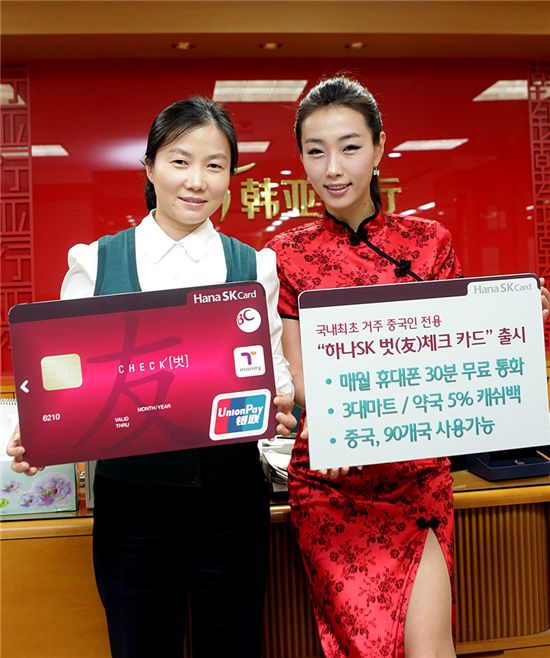 [아시아경제 김민진 기자] 하나SK카드가 국내에 거주하는 중국인을 대상으로 하는 전용체크카드인 '하나SK 벗(友)카드'를 출시했다고 5일 밝혔다. 현재 국내에 거주하고 있는 중국인은 모두 65만명. '하나SK 벗(友) 체크카드'는 하나금융그룹의 중국 영업기반 확대 전략으로 하나은행의 중국인 전용 '168통장', '중국어 폰뱅킹 서비스'에 이어 국내에서 신용카드 발급이 어려운 중국인에게 편리한 결제 수단을 제공하자는 취지에서 만들어졌다.하나SK카드에 따르면 이 카드는 신용카드 수준의 이용혜택을 제공한다. 매월 휴대폰 30분 무료 통화 서비스(전월 30만원 이상 이용시)를 제공하고 전월 10만원 이상을 쓰면 3대 대형마트ㆍ약국에서 사용금액의 5%를 캐쉬백 해준다. 일반 상해사망 및 후유 장해 보험에도 무료로 가입돼 최고 1000만원까지 보장받을 수 있다.선불 교통카드 기능도 탑재돼 있다. 하나은행 168통장 고객이 카드를 만들 경우 각종 은행 수수료 월 10회 면제, 송금 환율을 30% 우대 서비스도 제공한다.중국 본토 150만개 가맹점에서도 사용 가능하고 홍콩, 마카오, 싱가폴, 일본 등 90개 국가의 은련(CUP) 가맹점과 ATM에서도 해외이용 수수료 없이 사용할 수 있다.카드 발급은 하나은행 중국인 전용 데스크를 운영하는 안산 원곡동지점, 서울 구로동지점, 대림동지점, 신길동 지점 등에서만 가능하다. 연회비는 없다.김민진 기자 asiakmj@<ⓒ세계를 보는 창 경제를 보는 눈, 아시아경제(www.asiae.co.kr) 무단전재 배포금지>김민진 기자 asiakmj@<ⓒ아시아 대표 석간 '아시아경제' (www.newsva.co.kr) 무단전재 배포금지>