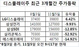 [아시아경제 김유리 기자]최근 업황 부진으로 고전을 면치 못했던 디스플레이주들에 '아몰레드(AMOLED, 능동형유기발광다이오드) 광명'이 내려질까.대부분의 디스플레이주들은 지난 3개월간 적게는 현상유지, 많게는 50% 이상 조정을 받았다. 삼성전기는 지난 8월 초 대비 9.93%, 삼성SDI는 12.85% 가량 하락했다. 에스에프에이는 14.92% 조정을 받았고 실리콘웍스는 무려 52.92% 하락의 쓴 맛을 보고 있다. LG디스플레이만 등락을 반복하다 현재 6.42% 상승한 상태다.이같은 디스플레이주들의 주가 조정은 올 하반기 LCDㆍLED TV 재고 급증으로 이들 제품과 부품가격이 급락하면서 관련업체들의 실적이 악화된 영향이었다.그러나 내년부터는 LCD 업황회복과 더불어 '아몰레드'를 통한 디스플레이 업체들의 도약이 기대되고 있다. 증권업계 관계자들은 내년에 아몰레드 태블릿 PC가, 오는 2012년에는 아몰레드 TV가 상용화되며 본격적인 '아몰레드 시대'를 열 것이라고 전망했다. 향후 5년간 한국업체들의 아몰레드 생산능력은 20조원에 육박할 것으로 추정됐다.소현철 신한금융투자 애널리스트는 "아몰레드는 자체 발광으로 인한 빠른 응답속도로 인해 영화, 동영상 및 게임 등의 장점을 바탕으로 멀티미디어를 주로 사용하는 테블릿 PC와 스마트 TV에 최적의 디스플레이로 평가된다"며 "내년 테블릿 PC와 TV에 아몰레드가 채용될 것으로 예상되기 때문에 삼성전자와 LG디스플레이가 아몰레드에 대한 투자를 강화할 것"이라고 말했다. 삼성전자의 경우 이미 올해 3분기 아몰레드를 채용한 갤럭시S와 웨이브 스마트폰을 통해 스마트폰 시장점유율을 11.4%로 끌어 올려 대만 HTC를 제치고 세계4위로 도약했다. 내년 상반기에는 RIM을 제치고 세계3위 업체로 올라설 것으로 예상된다.정진관 한양증권 애널리스트는 "핸드셋에 적용되고 있는 아몰레드의 비중은 올해 2.5% 수준에 불과하다"면서도 "예정된 라인 신증설 투자를 감안하면 내년에는 약 10%, 2013년에는 약 20%에 이르게 될 것"이라고 추정했다. 아몰레드 양산성과 생산능력 확대가 국내 패널업체에 의해 주도되면서 양산장비와 소재 개발도 중요해 질 것이라는 분석이다. 과거 국내 반도체나 TFT LCD 업체의 경우 후발주자로 진입해 주요한 소재와 양산장비를 해외에 의존했던 것을 감안하면, IT용 아몰레드 패널의 경우 양산기술 및 소재에 대해 상대적으로 높은 자립도를 확보, 국내 기업에게 높은 부가가치를 창출해 줄 수 있을 것이라는 설명이다.한편 아몰레드 패널의 모바일침투율이 빠르게 진행되는 가운데서도 중대형 디스플레이에서의 TFT LCD 위상은 그대로 이어질 것으로 전망됐다. 박현 한화증권 애널리스트는 "4분기를 저점으로 LCD경기 회복이 예상되는 만큼 LCD주에 대한 적극적인 비중확대가 필요하다"며 "LG디스플레이 및 실리콘웍스, 에스에프에이, 테크노세미켐, 한솔LCD, 이엔에프테크놀로지 등 중소형주도 투자매력도가 높다"고 판단했다.김유리 기자 yr61@<ⓒ세계를 보는 창 경제를 보는 눈, 아시아경제(www.asiae.co.kr) 무단전재 배포금지>