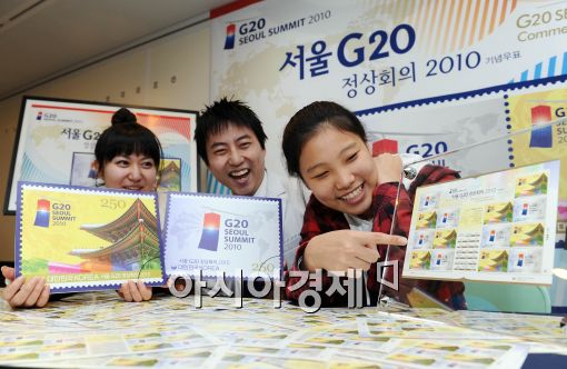 [아시아경제 이재문 기자]우정사업본부가 7일 서울 중구 중앙우체국 내 우표문화누리에서 G20 서울정상회의 기념우표를 선보이고 있다. 지식경제부 우정사업본부는 '서울 주요20개국(G20)정상회의 2010 기념우표' 2종 각 77만 장(총 154만 장)을 오는 11일부터 전국 우체국에서 판매한다고 밝혔다.이재문 기자 moon@<ⓒ세계를 보는 창 경제를 보는 눈, 아시아경제(www.asiae.co.kr) 무단전재 배포금지>