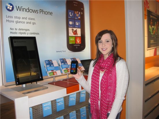 삼성전자가 AT&T에 공급하는 첫 윈도폰7탑재 스마트폰 '포커스'를 삼성관계자가 들어보이고 있다.