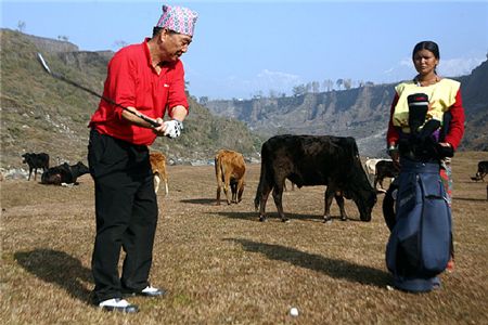네팔 히말라야골프장은 기계로 페어웨이를 깎는 대신 소와 양이 잔디를 뜯어 먹게 한다.
