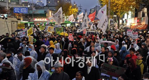 [아시아경제 이재문 기자]G20 정상회의 개막일인 11일 서울역 광장에서 'G20 규탄 국제 민중 공동행동의 날' 집회가 열린 가운데 남영역까지 가두 행진을 마친 참석자들이 비를 맞으며 마무리 집회를 갖고 있다.이재문 기자 moon@<ⓒ세계를 보는 창 경제를 보는 눈, 아시아경제(www.asiae.co.kr) 무단전재 배포금지>