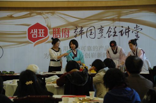 샘표 요리교실 지미원의 이홍란 원장이 북경대 교직원과 학생들에게 한국 전통음식을 소개하고 있다.