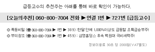 필자는 그 동안 재료와 이슈 그리고 실적과 수급이라는 4박자를 갖춘 종목들을 정확한 매수의 급소에서 추천한 결과 연속 상한가 랠리를 기록한 것을 비롯해 대부분의 종목들이 목표가 이상으로 충분히 급등을 하고 있다.필자는 이처럼 안타까운 현실을 두고 볼 수 없어 단기에 10배 이상의 대박수익률이 가능한 황금같은 종목을 단 며칠만 공개키로 하겠다. 길게 생각하지 말고, 고민도 하지 말라! 분명히 말하지만 지수와 무관하게 무조건적으로 달릴 수 밖에 없는 종목이다. 정말이지 지금까지 이런 종목은 없었다. 새로운 재료와 테마에 목말라 하는 현 시점에 동사의 재료가 공개되는 순간 투자자들은 열광 할 수 밖에 없을 것이며, 시장에 풀린 핫머니의 무차별적인 유입으로 세력들이 작정하고 날리게 되면 아무리 보수적으로 잡아도 단기 500%시세폭발로는 만족이 안될 극단적인 폭등랠리가 바로 나올 것으로 예상된다.제작년부터 500%~1000% 이상 날아간 남광토건, KB오토시스, 보성파워텍, 모건코리아, 케이디씨, 이녹스, 삼영홀딩스, 자티전자, 비티씨정보 등에 동참해 보지 못한 투자자라면 이번 종목만큼은 무슨 수가 있더라도 최대한 물량을 끌어모으길 바란다.우선 동사는 노벨상 후보로 거론될 만큼 획기적인 신소재를 개발완료함에 따라 매출을 본격화시키고 있으며, 특히 독점적인 고마진 구조라서 향후 수십년 동안의 먹거리를 확보하고 있다.특히 이 기술은 디스플레이, 메모리 등 전자소자 전분야에 걸쳐 즉시응용이 가능해 기존 반도체나 센서산업에 대변혁을 예고하고 있으며, 뿐만 아니라 태양전지, LED, 의료산업, 광소자, 항공우주분야, 로봇등 전 산업에 걸쳐 폭넓은 확장성을 가지고 있어 근세 100년 만에 나타나는 꿈의 기술이라 평가 받고 있다.강력한 재료와 핫이슈가 필요한 현 장세에서 이러한 동사의 재료적인 이슈는 수십배 터지는 대박주로 전혀 손색이 없다라고 판단 되어지며, 특히 현재의 거래량추이를 볼 때 대부분의 유통물량이 씨가 마를 정도로 매집이 완료된 것으로 보인다.이러한 종목은 경험상 급등이 시작되면 거래를 주지않고, 폭등하기 때문에 추격매수 한다는 것은 웬만한 강심장이 아니고서는 실로 불가능한 일일 것이다. 지금의 주가위치는 대급등의 서막을 위해 장기간 대바닥을 치고, 모든 이평선들이 밀집된 상태에서 거래량이 터지며 우상향 초기를 만들고 있는데 이것은 이미 대급등 파동의 신호탄을 알리고 있다.이젠 더 이상 장황하게 설명할 시간조차도 부족하다! 필자가 금일 너무나도 강력하게 추천하는 이 종목은 한마디로 말하자면 딱 한번 매수만으로도 큰 돈을 벌수 있는 일생일대 천재일우의 기회를 잡는 것이다.작년 말부터 1,000%이상 터진 케이디씨, 보성파워텍, 그리고 올해 300%~1,000% 날아간 대우부품, 매일상선, 자티전자, 삼영홀딩스, 비티씨정보과 같은 박종목을 놓친 투자자라면 이번만큼은 절대 머뭇 거리거나 망설이지 말고 과감하게 승부수를 던지길 바란다.