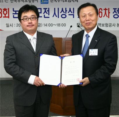 유창무 무역보험공사 사장(오른쪽)이 최우수상을 받은 부경대 이상하씨에게 상장을 주고 있다