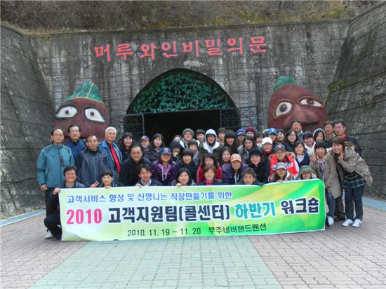 [아시아경제 왕성상 기자] 정부조달콜센터 상담사 50여명이 최근 워크숍을 갖고 ‘더 친절하고, 빠르고, 정확한 정보제공’을 다짐했다. 조달청 고객지원팀(팀장 강태주 서기관)은 지난 19~20일 전북 무주에 있는 무주네버랜드펜션에서 ‘2010 하반기 워크숍’을 갖고 고객서비스 향상과 신명나는 직장분위기 만들기에 앞장서기로 했다고 25일 밝혔다.조달행정의 최접점에서 입찰관련 정보제공을 맡고 있는 정부조달콜센터 상담사들과 고객지원팀 직원 등이 참가한 행사에선 주제발표와 분임토의, 뒤풀이 마당이 있었다.참가자들은 행사 첫날 밤 ▲효율적인 콜센터 인력 운용방안 및 대책(이종환 센터장·사무관) ▲신규 상담사 교육훈련시스템 점검 및 개선 대책(오건수 사무관) ▲정부조달콜센터 고객응답율 제고 방안(손병진 사무관) ▲후생복지 증진 등 내부고객 만족도 제고 방안(임근자 사무관)의 주제를 놓고 토론을 벌였다. 또 외부강사 초청 친절교육 및 특강(왕성상 아세아경제신문 중부취재본부장)도 있었다.장기자랑을 하며 즐거운 시간을 보내고 있는 조달콜센터 상담사들.