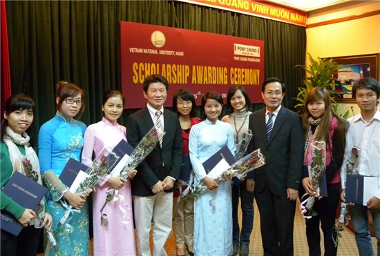 11월 25~26일 양일간 포니정재단(이사장 김진현)은 베트남의 하노이국립대학과 호치민국립대학에서 각각 30명씩 포니정장학생으로 선정된 총 60명의 대학생에게 장학증서를 전달했다. 사진은 25일 베트남 하노이 국립대학에서 열린 장학증서 전달식.