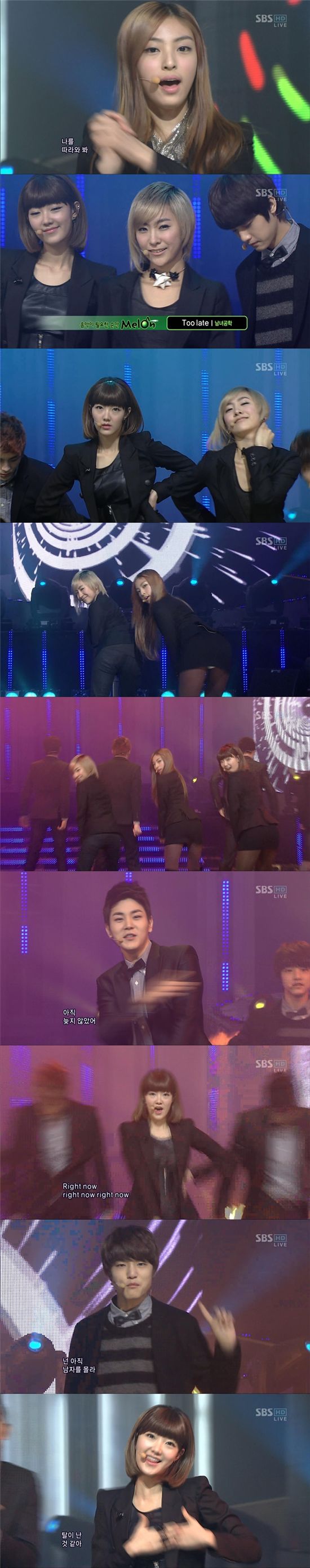 [스포츠투데이 최준용 기자]10인조 혼성그룹 남녀공학이 스페셜 무대를 통해 강렬한 무대를 펼쳤다.남녀공학은 28일 오후 생방송으로 진행된 SBS '인기가요'에 출연해 ‘투 레잇’과 ‘삐리뽐 빼리뽐’을 공개했다.이날 무대에서 남녀공학은 강렬한 블랙계열의 무대의상으로 상큼함과 발랄한 매력을 과시했다. 특히 중독성 짙은 ‘진동춤’을 선사하며 눈길을 사로잡았다. 아울러 남녀공학은 '투 레잇' 무대에서 한 치에 어긋남 없이 완벽한 군무로 탄성을 자아냈다. 특히 무대 중간 여성 멤버들이 엉덩이를 흔드는 안무로 팬들에게 강렬한 인상을 심어줬다.이날 무대에는 발목 수술로 인해 한빛효영 없이 9명의 멤버로 무대를 꾸몄다.한편 한빛효영은 지난 14일 오후 연습실 계단을 내려가던 중 발목이 부러지는 사고를 당해, 현재 수술 후 병원에 입원중이다. 스포츠투데이 최준용 기자 yjchoi01@<ⓒ아시아경제 & 재밌는 뉴스, 즐거운 하루 "스포츠투데이(stoo.com)">