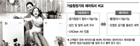 기존에 물로 실내공기를 걸러 세척하는 에어워셔(air washer) 방식에 비해 공기청정기 필터를 제품 내부에 장착해 공기 중 세균과 바이러스, 악취 등 오염물질을 걸러준 다음 항균가습이 이루어진다는 점이 큰 차이점이다.<b/>◆ 유해 바이러스 99.9% 제거= 항바이러스 헤파필터는 지난해 충남대학교 독감연구소, 일본낙농학원대학, 일본 츠쿠바 대학, 중국농업부 등 권위 있는 국제연구기관들로부터 공기 중 유해 바이러스를 99.9% 제거하는 효과가 있는 것으로 검증됐다.가습 디스크식 청정기(모델명 APM-1510FH)는 세균 번식이 쉬운 초음파 가습식 대신 항균 코팅된 디스크를 통해 세균보다 작은 크기의 물 입자를 분사, 실내공기에 습기를 입히는 방식으로 설계됐다. 5단계의 필터를 거쳐 오염물질이 걸러진 청정한 공기는 물에 젖은 디스크를 통과하면서 미세한 물 입자와 결합해 다시 외부로 분사된다. 이때 물 입자는 일반 초음파 가습기의 최대 5만분의 1에 해당하는 0.1 나노미터(㎛) 크기로 매우 작고 가벼워 먼 거리까지 균일하게 퍼진다. 디자인면에서도 올해 세계 최고 권위의 디자인 인증인 '독일 레드닷(reddot)'을 수상할 만틈 뛰어나다.가습 필터식 청정기(모델명 APM-1010DH) 역시 5단계 필터를 통과한 공기가 가습 필터를 통과하면서 습기를 머금고 이 공기가 다시 자연기화식으로 외부에 분사된다. 자연기화식 가습은 물에 젖은 가습 필터에 바람을 일으켜 물기를 증발시키는 방식으로 입자 크기가 작아서 습기가 멀리 퍼지는 장점이 있다. 이우태 마케팅본부장은 "공기정화와 가습, 항균 등 복수의 기능을 만족시키는 공기청정기가 각광받고 있다"며 "항바이러스 공기청정 기능과 세균 및 바이러스 무력화, 적정 습도까지 조절해주는 기능으로 컨버전스 가전 시장의 선두에 설 것"이라고 말했다.