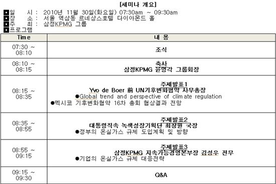 [아시아경제 임선태 기자]삼정KPMG(회장 윤영각)가 오는 30일 '탄소규제 대응 세미나'를 개최할 예정이라고 29일 밝혔다. 탄소규제 대응 세미나는 이보 드 보어 전(前) UN기후변화협약(UNFCCC) 사무총장이 참석한 가운데 서울 역삼동 르네상스호텔 다이아몬드홀에서 열릴 예정이다. 오전 7시30분부터 2시간동안 진행되는 이번 세미나에서 이보 드 보어 전 사무총장이 '멕시코 기후변화협약 16차 총회 협상결과 전망'을 주제로 발표에 나선다. 이밖에 최창원 대통령직속 녹색성장기획단 국장과 김성우 삼정KPMG 전무가 각각 '정부의 온실가스 규제도입 계획 및 방향', '국내 탄소규제 도입에 따른 기업 대응방안' 등에 관한 연사로 나선다. 김성우 전무는 "삼정KPMG 지속가능본부는 기업 맞춤형 탄소관리 통합 툴킷(Toolkit), 선진기업들의 탄소감축수단 데이타베이스(DB) 등을 구축하고 국내외 기업들의 정책 자문에 응하고 있다"며 "이번 세미나는 탄소규제에 관한 궁금증을 해소하고 대응전략을 수립하는데 도움을 줄 수 있을 것"이라고 밝혔다. 이보 드 보어 전 사무총장은 세계 탄소규제 제도 도입에서 핵심적인 역할을 맡고 있는 인물로 각국의 온실가스 감축 목표를 담은 교토의정서 서명을 이끈 장본인이다. 네덜란드와 UN 등에서 환경분야의 요직을 역임했고 현재는 삼정KPMG의 특별고문 역할을 담당, 고객기업의 전략수립을 지원하고 있다.