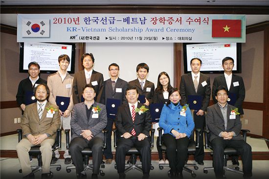 오공균 한국선급 회장(앞줄 가운데)과 베트남 유학생들이 지난 29일 한국선급 장학증서 수여식을 마치 후 기념촬영하고 있다.