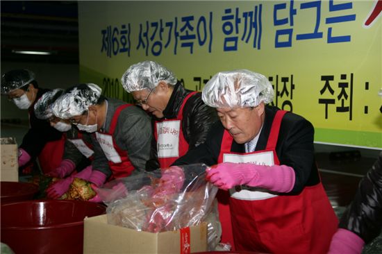 [아시아경제 박종일 기자]박홍섭 마포구청장(오른쪽 첫번째)과 이종욱 서강대학교 총장(오른쪽 두번째)이 11월 30일 서강대학교에서 서강대 교수진 재학생 외국인학생 자원봉사자 등 150명이 참여하는 사랑의 김장담그기 행사를 가졌다.올해로 6회째를 맞는 사랑의 김장 나눔 행사는 서강대학교가 있는 마포구내 저소득 주민을 위한 행사로 이 날 4500kg의 김장김치를 담가 저소득 400가구와 사회복지 시설에 지원한다. 박종일 기자 dream@<ⓒ세계를 보는 창 경제를 보는 눈, 아시아경제(www.asiae.co.kr) 무단전재 배포금지>