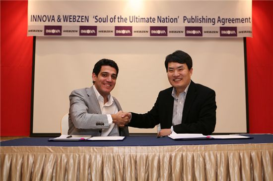1일 웹젠 김창근 대표(오른쪽)와 러시아 INNOVA사의 Gevork Sarkisyan 대표가 '썬:월드에디션' 러시아 서비스 계약을 체결하고 있다.