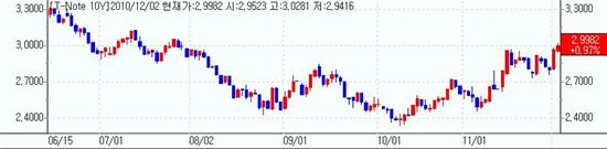 2일(현지시간) 오후 5시4분 현재 뉴욕채권시장에서 10년만기 국채금리가 전장대비 3bp 상승한 2.99%를 기록했다. 장중 3.0257%까지 올라 지난 7월29일이후 최고치를 보였다. 10년물 금리는 전일 17bp가 오르며 지난달 15일이후 최대상승폭을 나타낸바 있다. 10년-30년만기 국채금리간 스프레드는 127bp를 기록해 1개월만에 최저치를 기록했다.미 중앙은행은 이번주 275억달러어치의 국채를 매입했다. 익일에도 추가로 매입할 예정이다. 제임스 블러드 세인트루이스 Fed 총재는 워싱턴에서 가진 프리젠테이션에서 “추가양적완화정책으로 인해 경제가 빠르게 회복되고 있고, 실질이자율도 기대보다 높아지고 있다”고 평가했다.전미부동산중개인협회(NAR)는 10월 미결주택판매가 10% 증가했다고 발표했다. 직전달에는 1.8% 하락한바 있다. 블룸버그 예측평균치는 1% 하락이었다.미 노동부는 지난달 27일기준 주간실업수당청구건수가 2만6000건 증가한 43만6000건이라고 밝혔다. 11월 고용이 15만명 증가할 것이라고 블룸버그가 87명의 이코노미스트들을 대상으로 한 조사에서 예측했다. 미 노동부는 익일 11월 고용동향을 발표할 예정이다.ECB가 프랑크푸르트에서 회의를 갖고 정책금리를 1%로 동결했다. ‘심각한’ 시장상황에 따라 비상시 취했던 긴급대출프로그램 등 완화정책들을 연장키로 했다. 아일랜드가 지난달 28일 850억유로(미화 1120억달러) 규모의 유럽구제금융을 받기로 결정했다. 이는 그리스에 이어 두번째 지원결정이다. 유로존은 금융위기가 포르투갈과 스페인으로까지 확산될 가능성을 차단하고자 이같이 결정한 것으로 알려졌다.미 재무부가 다음주 660억달러어치의 국채입찰을 실시한다고 밝혔다. 이는 ICAP 예측치와 부합하는 것이다. 7일 3년물 320억달러를 시작으로, 8일 10년물 210억달러를, 9일 30년물 130억달러를 각각 입찰할 예정이다.블룸버그가 은행과 증권사들을 대상으로한 조사에서 미 10년만기 국채금리가 내년말 3.23%를 기록할 것으로 전망했다.김남현 기자 nhkim@<ⓒ세계를 보는 창 경제를 보는 눈, 아시아경제(www.asiae.co.kr) 무단전재 배포금지>