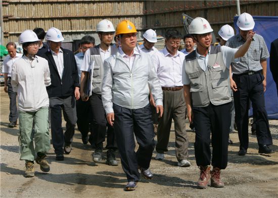 문충실 동작구청장과 간부들이 재개발 현장을 둘러보고 있다.