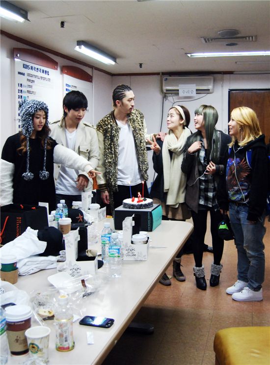[스포츠투데이 박건욱 기자]그룹 시크릿과 언터쳐블의 가족같은 사진이 공개됐다. 시크릿은 지난 2일 서울 여의도 KBS 신관 공개홀에서 생방송으로 진행된 KBS2 '뮤직뱅크' 대기실을 찾아 컴백 무대를 갖는 언터쳐블을 응원했다.이들은 사진을 함께 찍으며 돈독한 선후배의 정을 과시하며 즐거운 시간을 보냈다는 후문이다. 특히 사진 속 언터쳐블의 슬리피는 시크릿 선화의 어깨에 손을 올리고 있으며, 선화는 이런 슬리피를 겸연쩍게 쳐다보고 있어 보는 이들로 하여금 웃음을 자아냈다. 아울러 지은은 케이크를 가리키며 앙증맞은 표정을 짓고 있어 다시 한번 '초딩포스'(?)를 발산하기도 했다. 이에 디액션은 투정부리는 딸을 바라보는 아버지 표정으로 큰 웃음을 선사하고 있다. 한편 언터쳐블은 2집 정규 음반 '후즈 핫(Who's HOT)'의 타이틀곡 '난리 블루스'로 인기몰이 중이다.