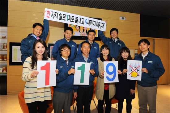 현대중공업 임직원들이 ‘한 가지 술로 1차로 끝내고 9시까지 마무리하자’는 ‘119 송년문화’ 캠페인을 홍보하고 있다.