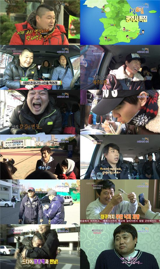 [스포츠투데이 최준용 기자]‘1박2일’이 6대 광역시 특집을 통해 따로 또 같이 전략으로 재미와 유익함을 동시에 잡았다.5일 방송된 KBS2 ‘해피선데이-1박2일’에서는 5개 광역시를 찾아 미션을 수행하는 ‘광역시 특집’이 그려졌다.이날 멤버들은 오프닝 장소인 대전을 제외한 인천, 대구, 부산, 울산, 광주 등 5개 광역시에 각자 흩어져 다섯 개 미션을 모두 해결해야 했다.릴레이 방식으로 시간 안에 미션을 모두 수행하고 오프닝 장소였던 대전에 멤버들은 저녁 7시까지 집결해야 했다. 미션이 성공하면 아늑한 실내 취침이 보장되고 반면 실패 시에는 대전에서 가장 붐비는 번화가에서 야외 취침을 하는 무시무시한 벌칙이 기다리고 있었다.이날 강호동은 대구광역시를 찾아 100년 전 대구의 모습을 사진으로 담아야 하는 미션을 수행했다. 어렵사리 미션을 성공한 강호동은 울산에 있는 김종민에게 미션을 전달했다.김종민의 미션은 간절곶에 있는 소망우체통에 멤버 중 한명에게 엽서를 전달하는 것이었다. 김종민은 은지원에게 올해 안에 2세 소식을 듣고 싶다는 엽서를 보냈다.이와 함께 은지원, 이승기는 인천과 부산을 방문해 그 지역 사람들과 명소들을 방문하며 정보를 전달했다.이날 ‘1박2일’에서는 야구선수 양준혁, 이종범 등 각 지역을 대표하는 유명 인사들을 만나 그들의 진솔한 이야기를 들었다. 또 그 지방을 대표하는 토속 음식들과 명소들을 체험하고 소개했다.또 방송을 위한 방송이 아니라 멤버들이 직접 발로 뛰며 다양한 정보와 가이드 역할을 훌륭하게 소화했다. 아울러 사람 사는 냄새가 물씬 풍겨져 나오는 유익함을 선사했다. 스포츠투데이 최준용 기자 yjchoi01@<ⓒ아시아경제 & 재밌는 뉴스, 즐거운 하루 "스포츠투데이(stoo.com)">