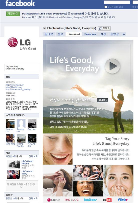 [아시아경제 김진우 기자]LG전자가 6일 '페이스북'(//www.facebook.com/theLGstory)을 오픈한다.LG전자는 페이스북을 통해 고객들과 함께 이야기를 만들어간다는 의미에서 'the LG story'로 이름 지었다.LG전자 페이스북은 기업 소개 및 관련 뉴스 등을 소개하고 브랜드·기업문화·사회적 책임활동 등 다양한 주제로 고객들과 대화하는 공간으로 활용할 예정이다. LG전자는 페이스북 내에 고객들이 스토리를 담을 수 있도록 '담벼락' 'Life's Good' '이벤트' 등 다양한 코너를 만들었다.'생활 속의 LG'를 주제로 고객들이 자유롭게 의견을 개진할 수 있도록 '담벼락' 기능을 고객들에게 개방한 것이 특징이다. 'Life's Good'이라는 LG전자만의 특화메뉴는 LG전자의 다양한 소식들과 이벤트 등을 소개하는 공간으로 활용된다. LG전자는 앞으로 이슈에 대해 토론하는 '토론', 다양한 주제의 설문조사를 하는 'Poll', 외부 필진이 연재 이야기를 싣는 'LG in Story' 등 코너를 통해 고객들이 참여하고 즐길 수 있는 공간을 늘려나갈 예정이다.LG전자는 지난해 3월 기업 블로그를 연 데 이어, 올해 2월에는 트위터를 개설했으며, 이번 '페이스북' 개통을 통해 고객과의 소통, 프로모션 창구, 콘텐트 박물관 등의 역할을 할 수 있을 것으로 기대하고 있다. LG전자는 앞으로 생활가전 페이스북도 오픈해 신제품 발표회를 생중계 하는 등 다양한 제품 마케팅의 장으로 활용한다는 계획이다.LG전자 관계자는 "페이스북은 고객과 함께 만드는 이야기를 쌓아가는 공간"이라며 "'솔직한 친구가 되자'는 좌우명을 가지고 운영해 나갈 것"이라고 말했다.한편 LG전자는 기업 블로그 방문자 100만명과 트위터 팔로워 1만명 돌파를 기념해 감사 이벤트를 벌이면서 페이스북 오픈 이벤트도 함께 진행할 예정이다.LG전자는 이벤트 주제를 '감사'로 정하고 온라인과 오프라인에서 평소 고마웠던 사람들에게 감사할 수 있는 '감사 캠페인'을 벌여나간다는 계획이다. 한편 페이스북은 전 세계 5억8000만명 이상이 사용하고 있는 세계 최대의 소셜네트워크 서비스로 국내에서만 210만명 이상이 사용하고 있다.