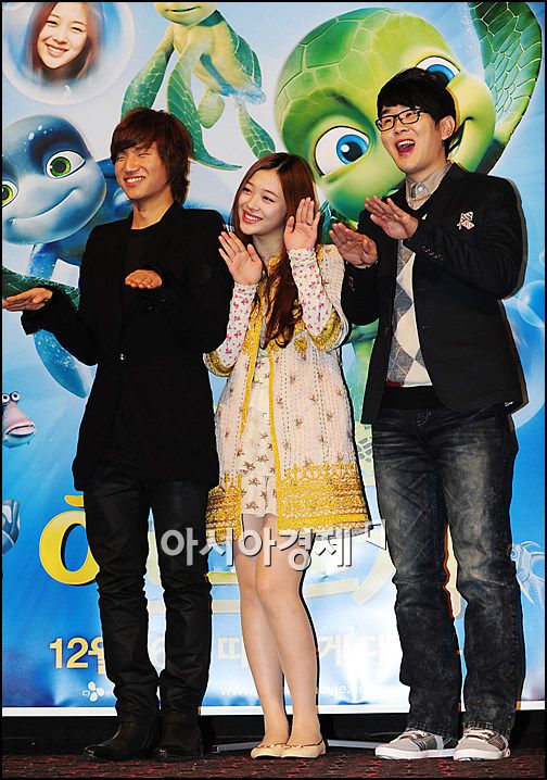 [스포츠투데이 박성기 기자]그룹 빅뱅의 대성과, f(x)의 설리, 개그맨 윤형빈이 7일 오후 2시 서울 왕십리CGV에서 진행된 애니메이션 '새미의 어드벤쳐 3D' 기자시사회에서 밝게 웃고 있다.