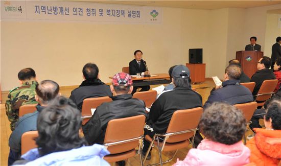 [아시아경제 박종일 기자]김성환 노원구청장은 8일 오전 11시 월계2동 주민센터에서 열린 ‘지역난방 개선 의견 청취과 복지정책설명회’에 참석했다. 김 구청장은 고비용 비효율로 구민을 힘들게 하는 지역난방을 반드시 개선하겠다고 말했다. 박종일 기자 dream@<ⓒ세계를 보는 창 경제를 보는 눈, 아시아경제(www.asiae.co.kr) 무단전재 배포금지>
