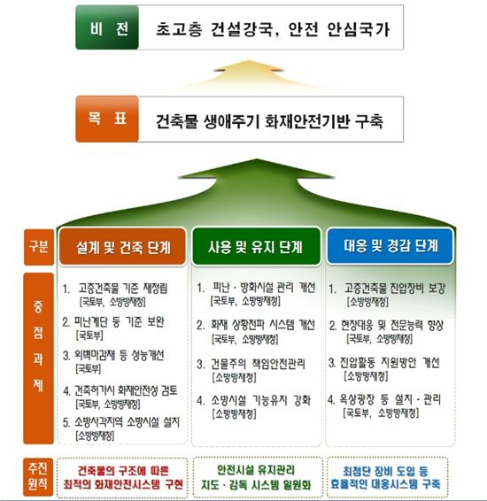 [아시아경제 조민서 기자]앞으로는 30층 이상 고층건물에는 피난전용승강기를 설치하고, 건축물 외벽에는 준불연 이상의 마감재를 써야 한다. 최근에 발생한 부산 해운대 우신골든스위트 화재와 같은 사고의 재발을 막기 위해서다.국토해양부는 소방방재청과 공동으로 고층건축물 안전관리에 대한 종합적인 개선대책을 마련해, 지난 9일 제70회 국가정책조정회의에 상정했다고 12일 밝혔다.이번 종합대책은 고층건축물의 생애주기적 안전기반을 구축하기 위해 '설계·건축'-'사용·유지'-'대응·경감' 단계별로 문제점을 도출하고, 이를 해결하기 위한 개선대책으로 13개 중점분야, 45개 세부과제를 선정해 강력하게 추진해 나간다는 계획이다.현재(8월 기준) 국내에서는 30층 이상 고층 건축물이 963개소에 달하는 등 고층건축물에 대한 수요가 증가하면서 안전관리 대책마련의 필요성도 높아진 상황이다. 이번 개선대책 안에서는 초고층 건축물에 대한 분류를 세밀히 하고 있다. 현재는 11층 이상 고층건축물(소방법령)과 50층 이상 또는 200미터이상 초고층건축물(건축법령 및 초고층특별법령)로 구분해서 관리되고 있다. 이중 30~49층, 120~200m를 '준 초고층' 건축물로 분류해, '초고층건축물'에 준하는 관리를 받도록 할 방침이다. 준 초고층건축물은 중간에 피난안전층(구역)을 설치하거나 피난계단의 폭을 확대(1.2→1.5m)해 피난공간으로 활용해야 한다. 준 초고층 이상 건축물에는 앞으로 피난전용승강기를 설치해 비상시 피난안전층 또는 15층마다 직통으로 운행하게 된다. 현재 마련돼 있는 피난계단(진입·피난겸용), 비상용승강기(소방관 활용)로는 대피에 한계가 있다는 지적이다.또 이들 건축물 외벽에는 준불연 이상의 마감재(심재, 접착제, 단열재 포함)를 의무적으로 사용해야 한다. 각 층 사이에 화재확산방지구조를 설치하는 경우에는 난연재료를 사용할 수 있다.11층 이상 고층건물은 건축허가를 받을 시 소방차량 진입이나 작전 공간을 확보했다는 것을 검증해야 한다. 또 준 초고층 이상 건축물에 대한 건축허가 동의기간도 7일에서 10일로 연장한다. 피난, 방화시설에 대한 점검도 강화된다. 11층 이상 고층건축물에 대하여 지자체 및 소방관서가 합동으로 정기점검을 실시하게 되며, 비상구 '방화문'의 유지·관리에 대한 감시시스템도 마련된다.화재 등의 예방과 유사시 진압을 효율적으로 관리하기 위하여 준 초고층 건축물 이상에 '종합방재실'을 의무적으로 설치해야 한다. 지상 1층 설치를 원칙으로 하되, 불가피한 경우 바로 위층 또는 아래층에 설치 가능하다. 공동주택의 경우에는 '관리사무소'에 설치할 수 있다. 또 건물주의 책임안전관리를 강화하기 위해 소방안전관리에 위법사항 등 적발시 처벌을 가하며, 소방시설점검업체 능력평가 공시제 도입 등으로 점검제도도 실시한다. 사전평가제도 도입된다.준 초고층 건축물 화재진압을 위한 고가사다리차를 구입하는 방안도 검토 중이다. 또 화재를 진압할 때 기존헬기에 방수포를 장착한 헬기를 도입하고, 장기적으로는 전용헬기를 사용하는 안도 논의되고 있다. 조민서 기자 summer@<ⓒ세계를 보는 창 경제를 보는 눈, 아시아경제(www.asiae.co.kr) 무단전재 배포금지>