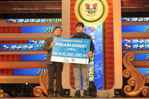 주도순 동아오츠카 본부장(왼쪽)이 롯데 자이언츠의 홍성흔 선수에게 포카리스웨트 특별상을 전달하고 있다.