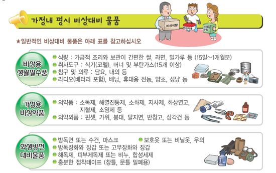 [아시아경제 배경환 기자] 시내에 폭격이 시작되면 어디로 대피하는 것이 가장 안전할까? 소방방재청에 따르면 ‘지하철역’이 최적의 장소로 이어 지하주차장, 지하상가, 지하보도 순이다. 특히 지하철역은 지표면에서 평균 4~10m아래 콘크리트 60~90cm 두께의 상부벽체와 각 지하층별 40cm 중간 슬래브구조로 건설돼 폭격과 붕괴로부터 가장 안전하다.일반적으로 적의 장사정포에 의한 공격 시 건축물의 철근 콘크리트 두께가 40㎝면 방호가 충분히 가능하기 때문이다.아파트의 경우도 벽 자체가 건물을 지탱하는 ‘벽체구조’로 돼있어 붕괴위험이 적다.하지만 주민대피시설은 화생방 무기에 의한 방호가 취약하다. 이에 소방방재청은 주민대피시설로 지정된 지하철역과 지하주차장 등을 대상으로 ‘화생방 방호기능 보강방안’을 연구 중에 있으며 내년에는 시범시설을 설치하고 표준모델을 개발하기로 했다.소방방재청에 따르면 우리나라의 대피시설은 적의 전투기나 미사일 공격으로부터 국민을 보호하기 위해 현재 전국에 2만5724개가 관리되고 있다. 대부분이 지하철역, 지하보도, 건물의 지하층으로 시·군·구 주민대피 계획에 따라 지정됐다.문제는 국민들의 신속한 대피다. 15일 오후 2시부터 실시되는 민방위 특별대피훈련은 실제 상황에 효과적으로 대처하기 위해 마련된 것이다.공습경보가 울리고 훈련이 시작되면 가정에서는 전기와 가스를 차단하고 가까운 지하대피소로 이동해야한다. 고층건물이나 아파트에서는 엘리베이터를 이용하지 말아야한다.차량을 운행 중인 경우에도 빈 터나 길가에 차를 정차하고 지하시설로 대피해야한다. 개회중인 국회나 재판이 진행되고 있는 법원도 훈련대상이다. 단 응급환자와 병상에 있는 환자는 실내 보호 조치된다.원칙적으로 축구나 야구, 농구 등 운동경기도 중단돼야 하지만 국제공인 기록경기는 진행된다.고속도로를 달리고 있는 차량은 훈련대상이 아니지만 출발 전인 경우에는 통제를 받는다. 이밖에 사무실 등에서 근무하고 있는 경우에는 필수 요원 1~2명을 제외한 나머지 근무자는 훈련에 참여해야한다. 반면 은행이나 증권사 등 금융기관에서는 입·출금이 중단된다.◇가정 내 평시 비상대비 물품, ‘이것’만은 미리 준비하세요.소방방재청이 권유하고 있는 일반적인 비상대비 물품은 ▲비상용 생활필수품 ▲가정용 비상약품 ▲화생방전 대비물품으로 나뉜다.식량은 가급적 조리와 보관이 간편한 것으로 쌀과 라면, 밀가루 등 15일~1개월분이 적당하다. 코펠과 같은 식기와 버너 그리고 부탄가스도 최소 15개는 필요하다. 또한 담요와 내의 그리고 배터리를 포함한 라디오나 전등, 양초, 성냥 등도 챙겨 놓아야한다.비상약품으로는 소독제와 진통제, 소화제, 지사제 등이 필요하며 그밖에 핀셋, 가위, 붕대, 탈지면, 반창고 등도 비상대비 물품이다.일반주민대피시설이 화생방 공격으로부터 안전하지 못한 탓에 방독면이나 보호옷, 비닐옷, 우의 등은 물론 해독제와 비부제독제 그리고 창틀과 문틀을 밀폐하기 위한 접착테이프도 필요하다.