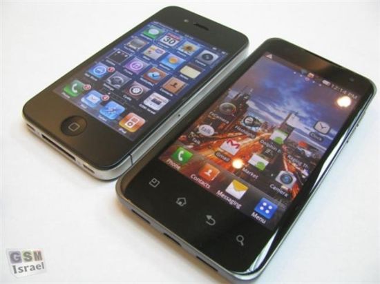 한 해외 블로그사이트에 공개된 LG 듀얼코어 스마트폰 스타(오른쪽) 사진. 아이폰4에 비해 월등히 큰 화면을 자랑한다.