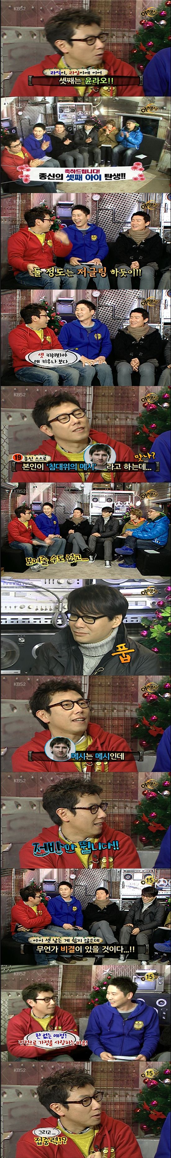 [스포츠투데이 최준용 기자]윤종신이 세 아이의 아빠가 된 비결을 밝혔다.19일 방송된 KBS2 '야행성'에서 윤종신은 세 아이의 아빠로 사는 모습을 허심탄회하게 말했다.이날 윤종신은 동료MC들과 게스트에게 셋째 딸의 탄생을 축하 받았다. 이에 윤종신은 "세명 정도는 아이를 키워봐야 애 좀 키우는구나 한다"고 거들먹 거렸다.또 주변 멤버들은 윤종신의 별칭인 ‘침대위의 메시’에 대해 집중적으로 캐물었다.게스트로 초대된 윤상은 “제수씨인 전미라에게 윤종신이 정말 침대위의 메시인지 물었는데 돌아온 것은 코웃음뿐이었다”고 폭로했다.이에 윤종신은 “사실 메시이긴 메시인데 전반전만 뛴다”고 말해 주변의 웃음을 유발했다.이어 세 아이의 아빠가 된 비결을 묻자 윤종신은 “별 다른 음식 같은 비결은 없고 항상 가정을 사랑하는 마음과 집중력”이라고 밝혀 웃음을 더했다.한편 윤종신은 지난 13일 오전 자신의 트위터를 통해 "방금 셋째 공주 '라오'가 태어났네요. 2.72kg. 우리 부인도 건강하구요. 감사합니다. 하나님"이라고 글을 남겼다.스포츠투데이 최준용 기자 yjchoi01@<ⓒ아시아경제 & 재밌는 뉴스, 즐거운 하루 "스포츠투데이(stoo.com)">