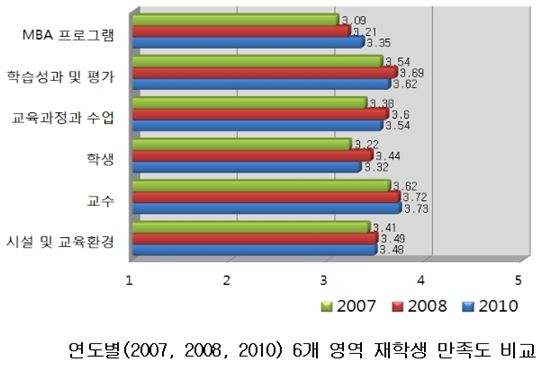 [아시아경제 김도형 기자]한국형 MBA(경영전문대학원)에 다니는 학생들의 만족도가 지난 2008년에 비해 조금 상승했지만 비싼 등록금에 대한 불만은 여전한 것으로 조사됐다.교육과학기술부(장관 이주호)가 지난 9월부터 이달까지 13개 한국형 MBA 재학생 1632명과 교수 80명을 대상으로 설문조사를 한 결과 프로그램·학습성과·교육과정·학생·교수·시설 등 6개 영역에 대한 만족도 범위는 3.32~3.73점(5점 만점)으로 2008년 조사 때(3.22~3.72점)보다 근소하게 높아진 것으로 나타났다.MBA 프로그램 만족도(재학생 기준)의 경우 2007년 3.09점, 2008년 3.21점에 이어 올해 3.35점으로 해마다 조금씩 높아지고 있다. 반면에 학습성과 및 평가(3.69→3.62), 교육과정 및 수업(3.60→3.54), 학생(3.44→3.32) 부문에서는 2008년에 비해 만족도가 조금씩 낮아진 것으로 나타났고 교수(3.72→3.73), 시설 및 교육환경(3.49→3.48) 등의 영역은 거의 동일한 만족도를 보였다. 구체적인 물음을 살펴보면 MBA 프로그램이 인적 네트워크 형성에 도움이 된다는 항목에서는 긍정적인 답변이 67.3%를 차지했고 직업·경력에 도움이 된다는 응답도 68.1%를 기록했다. 수업의 질(내용의 깊이, 영어강의, 토론식 강의 등)에 대한 만족도가 긍정적이라고 응답한 학생도 52.7%로 부정적(13.5%)이라는 답변을 압도했다.하지만 등록금에 대한 만족도를 살펴보면 평균점수와 긍정적인 답변의 비율이 크게 떨어졌다.MBA 프로그램의 등록금이 적절하다는 항목의 재학생 평균점수는 2.58점으로 다른 항목에 비해 현저히 떨어졌다. 2008년 조사에서 같은 항목의 평균점수는 2.56점으로 올해와 비슷했다.등록금 수준이 적절한가에 대한 물음에도 부정적이라는 응답 비율이 50.9%로 보통(29.3%), 긍정적(19.9%)이라는 답보다 훨씬 높았다.지난 2006년부터 운영 중인 한국형 MBA 과정은 수업연한(1년~2.5년)을 거쳐 학위를 받기위한 총 등록금이 최저 2400만원에서 최고 9000만원까지 분포하고 있으며 대체로 2년의 수업연한에 총 4000만원 내외의 학비가 드는 것으로 나타났다.한국형 MBA는 국제적인 수준의 경영능력을 갖추고 한국적 기업특성에도 밝은 경영전문인력을 체계적으로 양성하는 것을 목적으로 한다. 건국대, 고려대, 동국대, 서강대, 서울대, 성균관대, 숙명여대, 연세대, 이화여대, 전남대, 중앙대, 한양대, 인하대 등 13곳에 설치돼 있다.김도형 기자 kuerten@<ⓒ세계를 보는 창 경제를 보는 눈, 아시아경제(www.asiae.co.kr) 무단전재 배포금지>