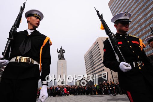 [아시아경제 윤동주 기자] 23일 서울 광화문 광장에서 열린 이순신 장군 동상 귀환 축하 행사에서 해군·해병대 의장대가 멋진 의장 시범을 보이고 있다.윤동주 기자 doso7@<ⓒ세계를 보는 창 경제를 보는 눈, 아시아경제(www.asiae.co.kr) 무단전재 배포금지>