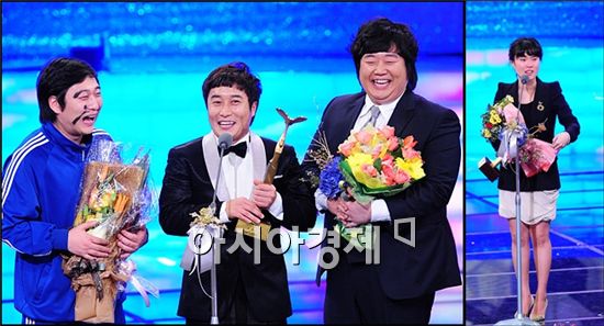 [스포츠투데이 최준용 기자]김병만·박지선이 2010 KBS 연예대상에서 코미디 최우수상을 수상했다.김병만·박지선은 25일 오후10시 15분부터 서울 여의도 KBS 신관 공개홀에서 150분간 생방송으로 진행된 2010 KBS 연예 대상 시상식에서 코미디 부문 최우수상을 수상했다.트로피를 받은 박지선은 “나한테 너무나 과분한 상인 것 같다. 개그콘서트 제작진 여러분과 선후배 동료들에게 이 영광을 돌리겠다”며 “똑똑한 개그맨이 아니라 진정한 광대가 되기 위해 노력하겠다”라고 감격의 눈물을 흘렸다.김병만은 “기사를 통해 내가 대상후보라는 말을 들었는데 최우수상 정말 감사하다”며 “이제 마음 편히 시상식을 지켜볼 수 있겠다”라고 유머있는 소감을 말했다.이어 “달인 시작한지 1년 만에 이상을 받게 됐다”며 “여러분의 많은 사랑 덕이고, 선후배 동료들에게 감사하다”고 감사를 표현했다.또 김병만은 “안타까운 것이 코미디가 점점 없어지고 있다. MBC, SBS 사장님 여러분 코미디에 투자해 주십시오”라고 의미심장한 멘트로 마무리 지었다.한편 이날 'KBS 연예대상'은 개그맨 신동엽, 신봉선과 이지애 아나운서가 함께 진행을 맡았다.스포츠투데이 최준용 기자 yjchoi01@<ⓒ아시아경제 & 재밌는 뉴스, 즐거운 하루 "스포츠투데이(stoo.com)">