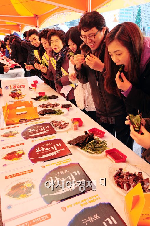 [아시아경제 윤동주 기자] 26일 서울광장에서 열린 '구룡포과메가 홍보 행사'에 참석한 시민들이 과메기 시식을 하고 있다.윤동주 기자 doso7@<ⓒ세계를 보는 창 경제를 보는 눈, 아시아경제(www.asiae.co.kr) 무단전재 배포금지>