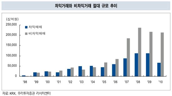 비차익거래 매매 규모는 지난해와 비슷했다. 매수 규모는 지난해 107조4786억원, 올해 103억8614억원이었으며 매도 규모는 지난해 109억9435억원 올해 113억7757억원이었다.최 연구위원은 "외국인의 비차익거래 활용이 두드러졌고 국민연금으로 대표되는 국내 대형 투자주체의 자금 집행도 활성화되면서 주식바스켓을 매수하는 순수한 비차익거래의 규모가 증가했다"고 설명했다. 이어 "주식형펀드의 환매 행진이 이어지는 과정에서도 비차익거래가 주로 이용된 것으로 파악됐다"고 덧붙였다.박병희 기자 nut@<ⓒ세계를 보는 창 경제를 보는 눈, 아시아경제(www.asiae.co.kr) 무단전재 배포금지>박병희 기자 nut@<ⓒ아시아 대표 석간 '아시아경제' (www.newsva.co.kr) 무단전재 배포금지>