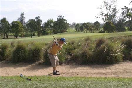 필자가 미국 올랜도 그랜드사이프러스골프장에서 벙커 샷을 하고 있다.