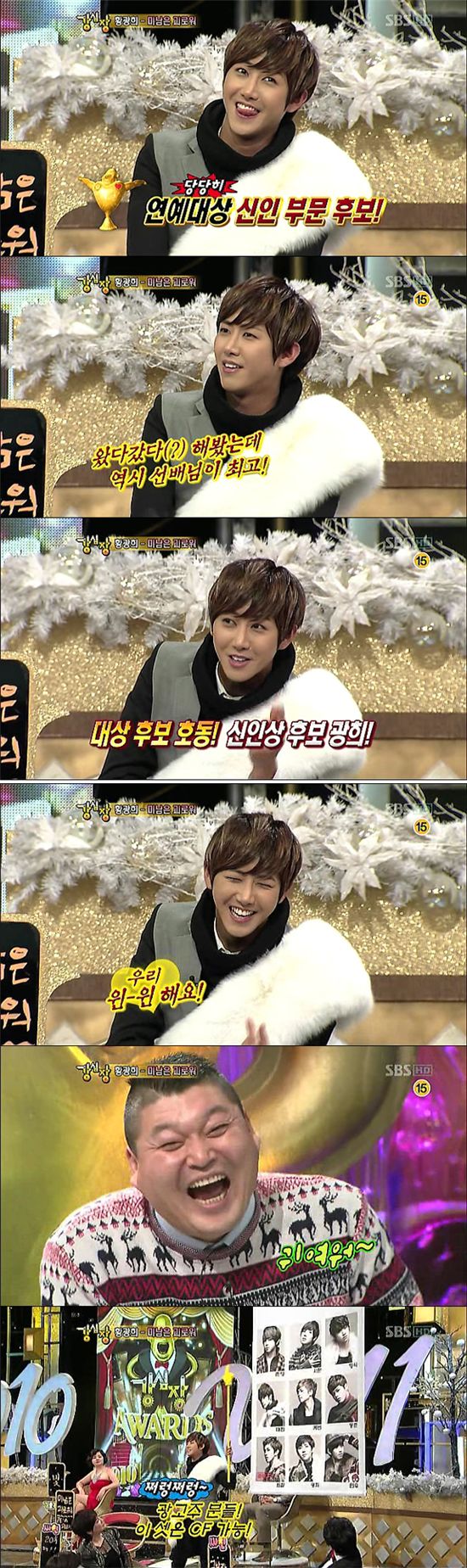 [스포츠투데이 박건욱 기자]제국의아이들 황광희가 거침없는 입담을 과시하며 다시한번 예능계 블루칩임을 입증했다. 황광희는 지난 28일 방송한 SBS 예능 프로그램 '강심장'에 출연해 "방송 후 보는 사람마다 웃고 전과 달리 섭외가 물 밀 듯이 들어와 인기를 실감한다"고 말했다.그는 이어 "언론에서도 많은 관심을 가져주시고 CF 문의도 많이 들어온다. 하지만 꼭 마지막에 탈락하더라. 아직 광고주의 마음까지는 잡지 못한 모양이다"라고 말해 웃음을 선사했다. 광희는 또 "(여러 프로그램에)왔다갔다 해봤는데 강호동 선배님이 최고다. 선배님이 가장 잘 이끌어주셨던 것 같다. 2011년에도 우리 윈윈하자"며 강라인을 선택해 눈길을 끌었다. 한편 이날 방송에서는 박신양, 김아중, 엄지원, 정겨운, 티아라 지연, 소연, 안문숙, 문천식 등이 출연해 재치 있는 입담을 과시했다.스포츠투데이 박건욱 기자 kun1112@<ⓒ아시아경제 & 재밌는 뉴스, 즐거운 하루 "스포츠투데이(stoo.com)">