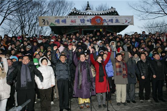 이어 박 구청장은 "예로부터 토끼는 부지런함과 지혜의 상징으로 알려져 있는데 신묘년 새애의 정기를 받아 더욱 힘차고 내실있게 ‘원칙과 상식이 존중받는 사람 중심의 중구’로 거듭날 수 있도록 중구 구정 운영에 최선을 다하겠다"고 밝혔다.그리고 박 구청장은 중국 진나라 부함(傅咸)의 '신천부(神泉賦)'에 보이는 '붉고 밝은 기운이 뜨는 해가 광채를 뿌리듯 한다'는 구절에서 '욱일치광(旭日馳光)' 4자를 추려내어 중구 발전을 기원해 본다고 말했다.남산의 일출시간인 오전 7시47분에 맞춰 신묘년 새해 행복한 대한민국과 서울시민, 중구민이 될 수 있도록 다같이 만세합창을 했다.그리고 중구민과 서울시민들의 새해 소망을 담은 풍선을 하늘 높이 올려 보냈다.박종일 기자 dream@<ⓒ세계를 보는 창 경제를 보는 눈, 아시아경제(www.asiae.co.kr) 무단전재 배포금지>