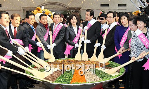 [아시아경제 윤동주 기자] 구제역으로 인해 급감한 소고기와 돼지고기 소비 촉진을 위해 열린 '한우-한돈 소비촉진을 위한 국회 시식회'가 5일 서울 여의도 국회의사장 의원회관 로비에서 열렸다. 행사에 참석한 나경원 의원, 이재오 특임장관 등 참석자들이 한우를 이용한 초대형 비빔밥을 직접 만들고 있다.윤동주 기자 doso7@<ⓒ세계를 보는 창 경제를 보는 눈, 아시아경제(www.asiae.co.kr) 무단전재 배포금지>