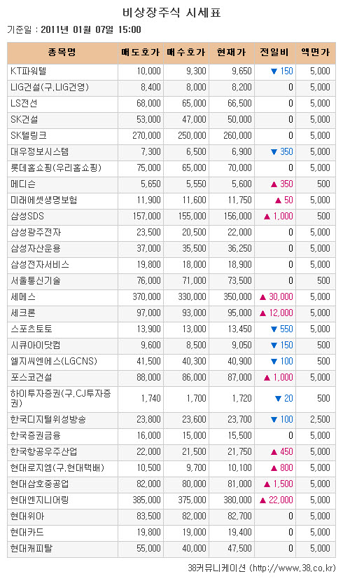 [아시아경제 천우진 기자]장외주식 시장이 하루 만에 반등했다.IPO(기업공개) 공모주로 오는 13일 공모 예정인 무선통신 솔루션 사업체 씨그널정보통신과 온라인 가격비교 사이트 운영업체 다나와가 각각 1만1900원(+4.39%)과 1만6800원(+1.82%)으로 상승했다. 이달 17일 공모 예정인 맞춤치료 개발업체 인트론바이오테크놀로지는 6800원(+1.49%)으로 최고가를 기록했다. 반면 함께 공모 예정인 블루콤은 1만5150원(-1.30%)으로 7일만에 하락 반전했다.이달 24일 공모 예정인 VoIP(인터넷연동)서비스업체 케이아이엔엑스는 8100원(+1.25%)으로 오름세를 나타냈다. 26일 공모 예정인 나노소재 제품 생산업체 나노신소재는 2만1500원(+2.38%)으로 5일 연속 상승했다.코스닥 심사 청구기업인 골프시뮬레이터 사업체 골프존은 8만7000원(+2.35%)으로 오르며 상승세를 이어갔다.삼성 관련 주로는 ICT(정보통신기술) 서비스업체 삼성SDS가 15만6000원(+0.65%)으로 올랐고 반도체 세정장비업체 세메스와 반도체 장비업체 세크론은 각각 35만원(+14.29%), 9만5000원(+12.16%)으로 연일 급등세를 이어갔다. 정보보안 솔루션업체 시큐아이닷컴은 9050원(-1.63%)으로 소폭 하락했다.현대 관련 주로는 토목 엔지니어링 서비스기업 현대엔지니어링이 38만원(+6.15%)으로 급등했고 조선업체 현대삼호중공업과 종합물류기업 현대로지엠(구.현대택배)은 각각 8만1000원(+1.89%)과 1만100원(+ 8.60%)으로 올랐다.그 밖에 종합건설사 포스코건설이 8만7000원(+1.16%)으로 7일 연속 상승했다. 자동차 부품업체 세원테크는 4800원(+17.07%)으로 급등하며 장을 마감했다.