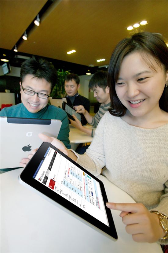 KT 직원들이 지급받은 아이패드로 기업용 상품 견적 사이트를 점검하고 있다.